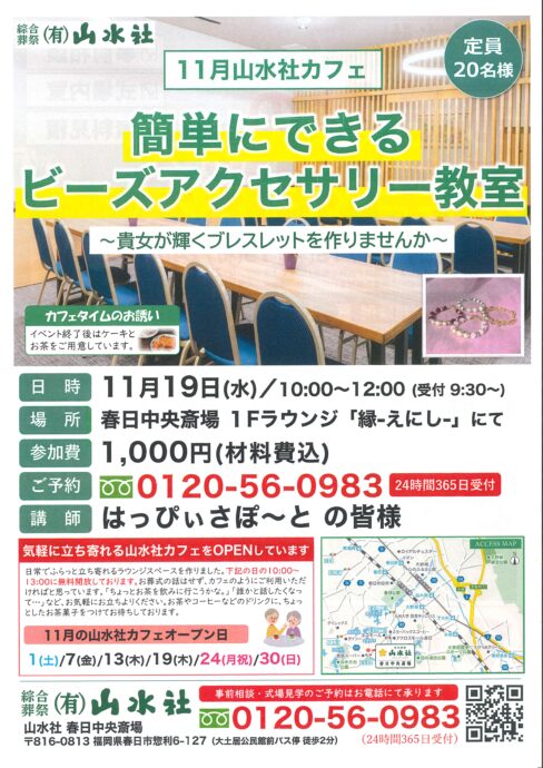さて、11月の山水社カフェイベントは、簡単にできるビーズアクセサリー教室を開催いたします。